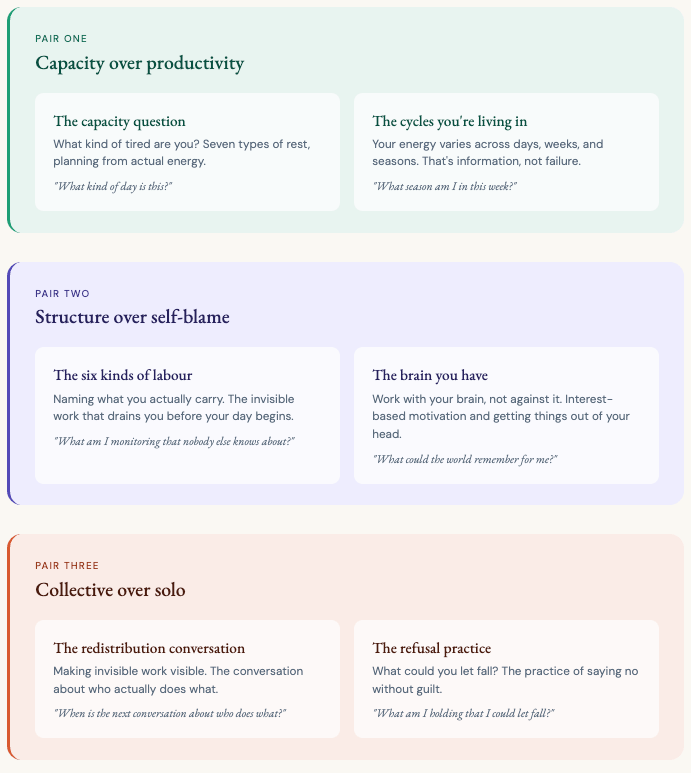 What can be redistributed, and what can you refuse? We use Eve Rodsky's CPE framework, Emily Nagoski's concept of Human Giver Syndrome, and Oliver Burkeman's thinking on finite time. These workshops are where the work moves from individual coping to shared responsibility and deliberate refusal. They're also the hardest, which is why we do them together.